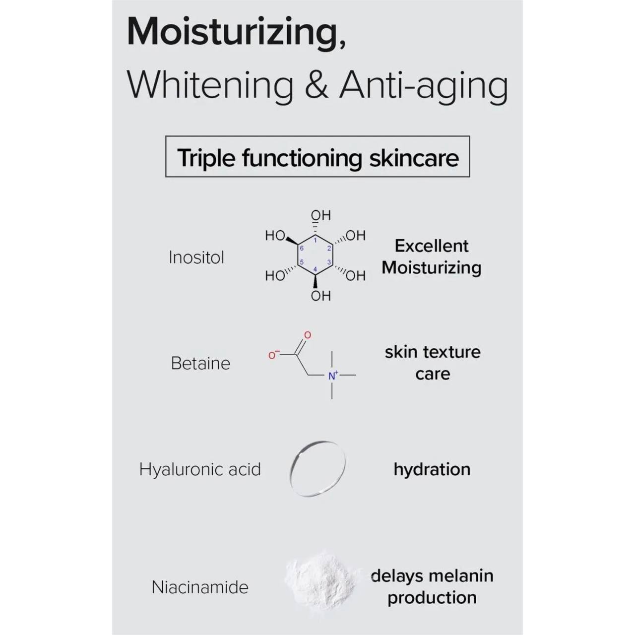 _اینوزیتول و بتائین با خواص مرطوبکنندگی، حفظ رطوبت پوست، تقویت سددفاعی پوست و تسکیندهندگی 💧🌧️