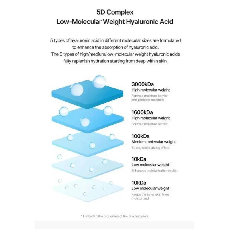 این محصول با استفاده از کمپلکس پنجگانه هیالورونیکاسید شامل ۵ نوع هیالورونیکاسید با سایز و وزن مولکولی متفاوت و هیالورونیکاسید ریز مولکول، تمامی لایههای پوست را در کوتاهترین زمان به طور کامل آبرسانی میکند. استفاده از هیالورونیکاسید ریز مولکول باعث افزایش سرعت و میزان جذب محصول و اثرگذاری بیشتر آن میشود.💧✨🔬